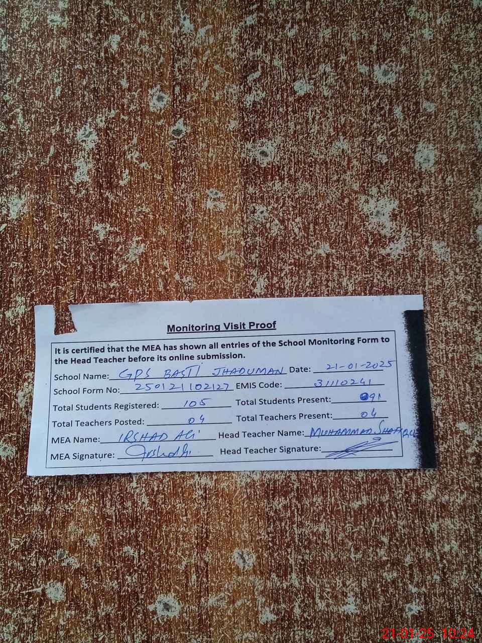 | EMIS Code: 31110241 | Name of School: GPS BASTI JHADUWAN | |||