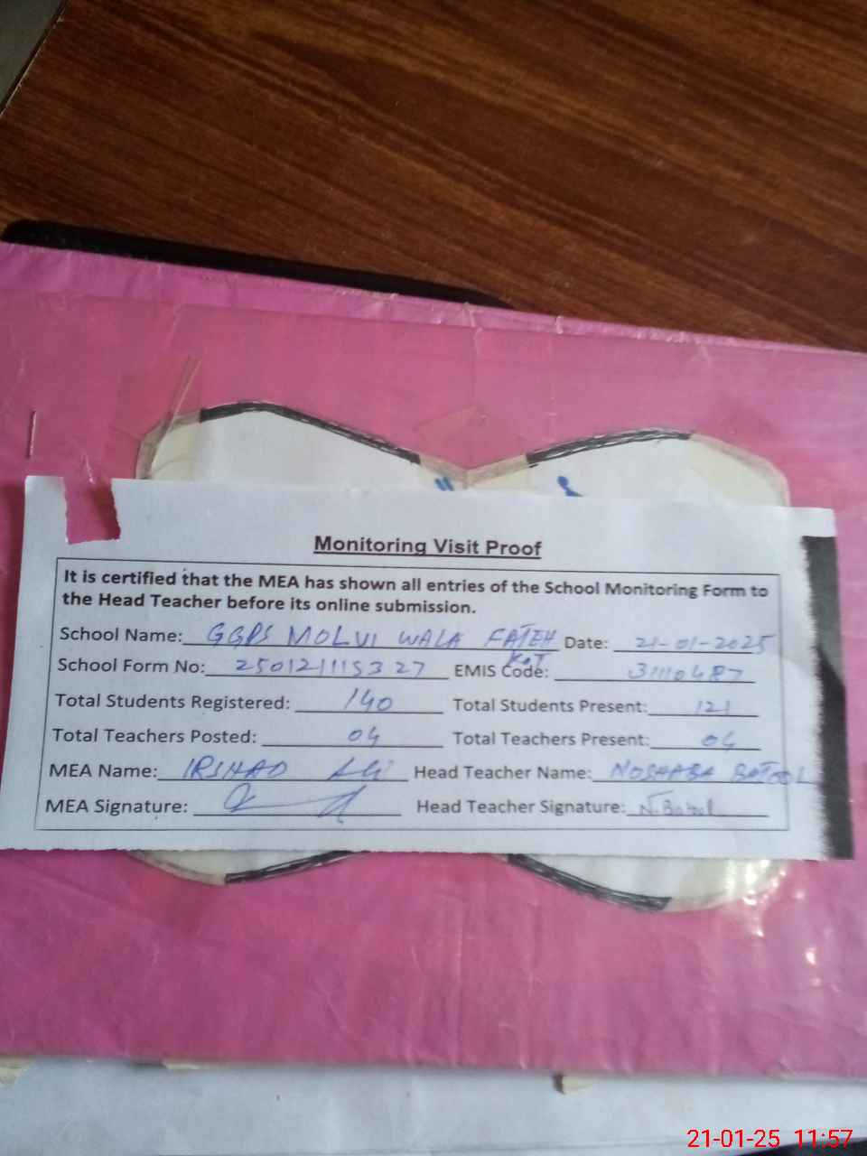 | EMIS Code: 31110487 | Name of School: GGPS MOLVI WALA FATEH KOT | |||