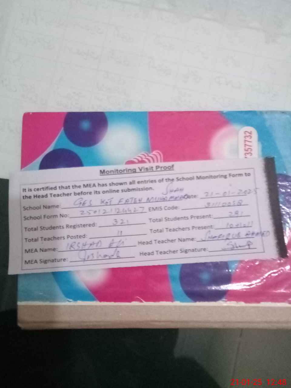 | Attendance Register | Head Teacher | MEA with School | Visit Proof |
