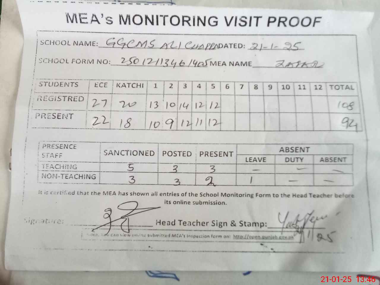 | Attendance Register | Head Teacher | MEA with School | Visit Proof |