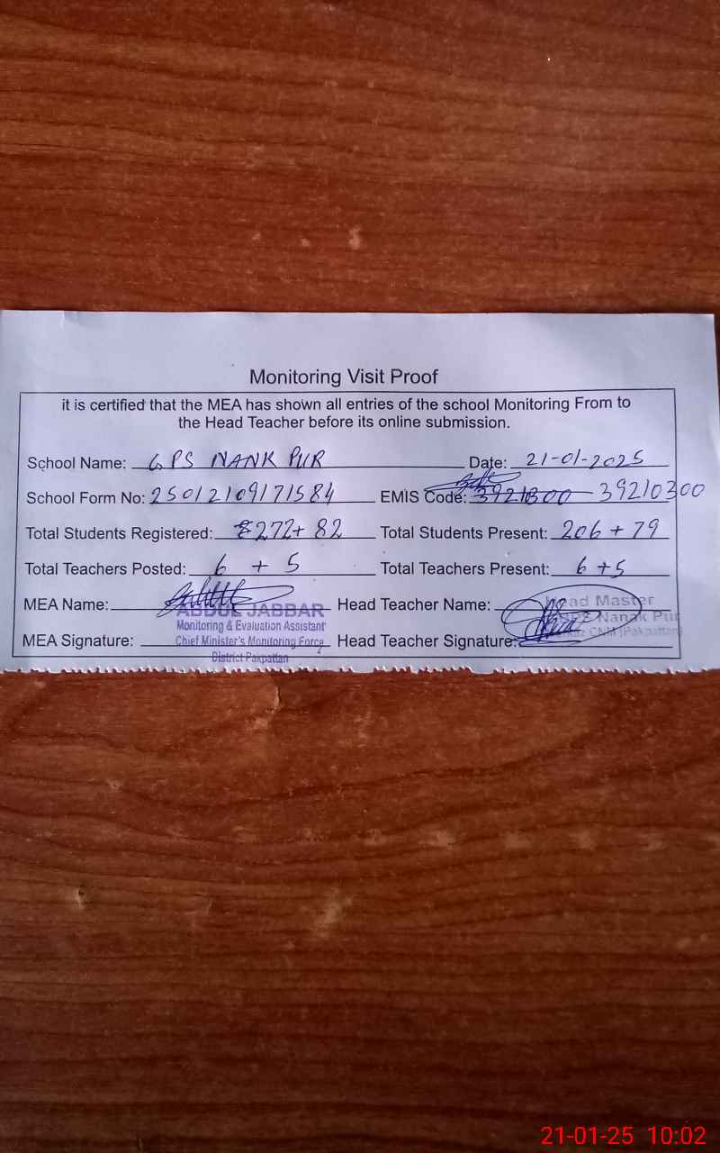 | EMIS Code: 39210300 | Name of School: GES NANAK PUR | |||