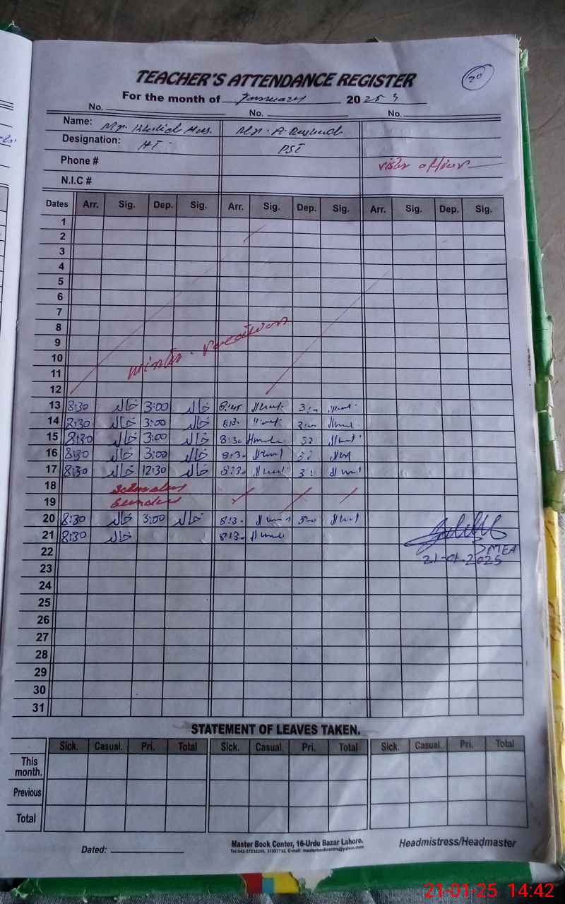 | Name: Kh**** Hu**** Designation: (School Headmaster's/Headmistress's) PST Phone/Cell Number: 03**** |