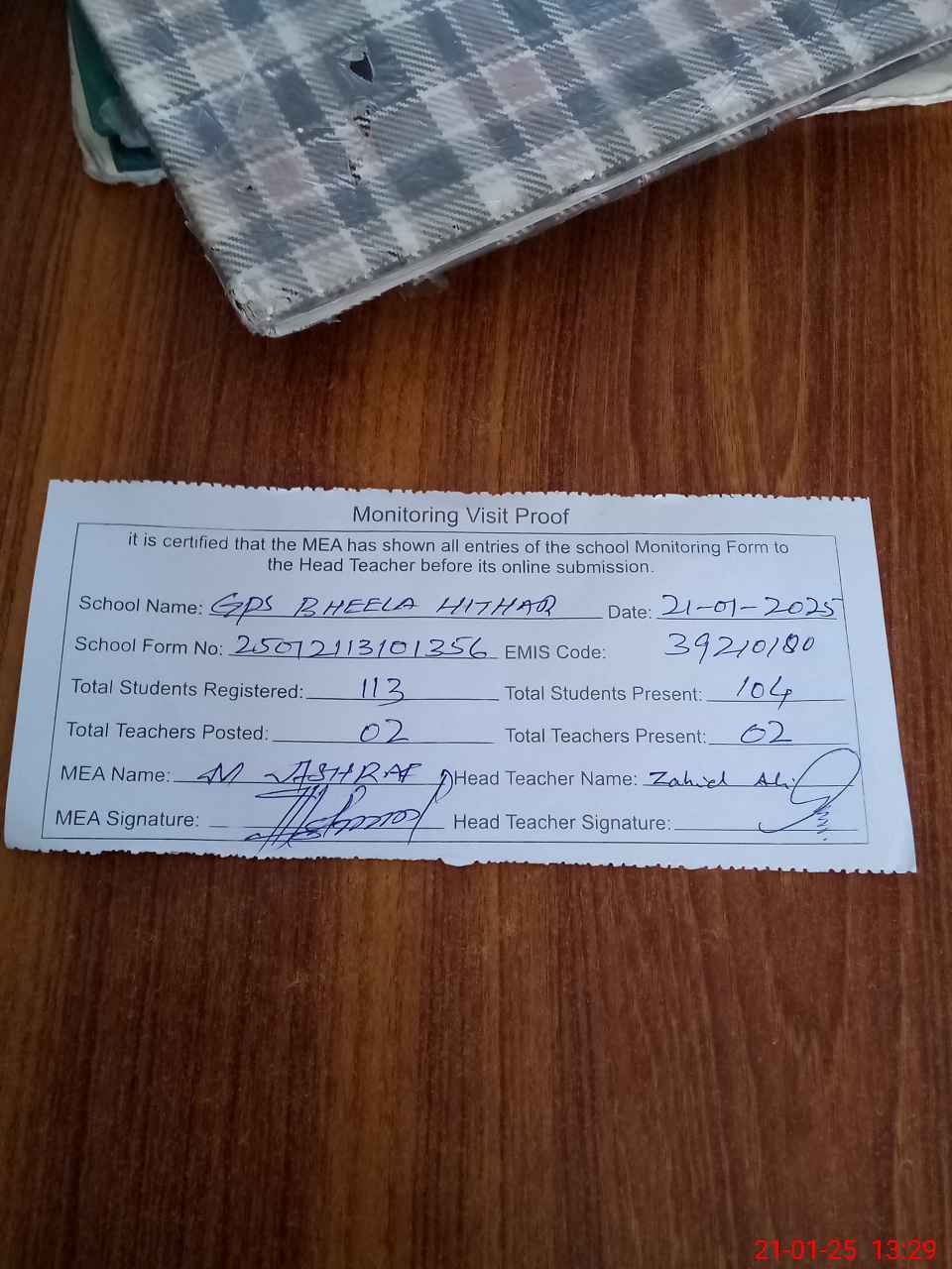 | EMIS Code: 39210180 | Name of School: GPS BHEELA HITHAR | |||