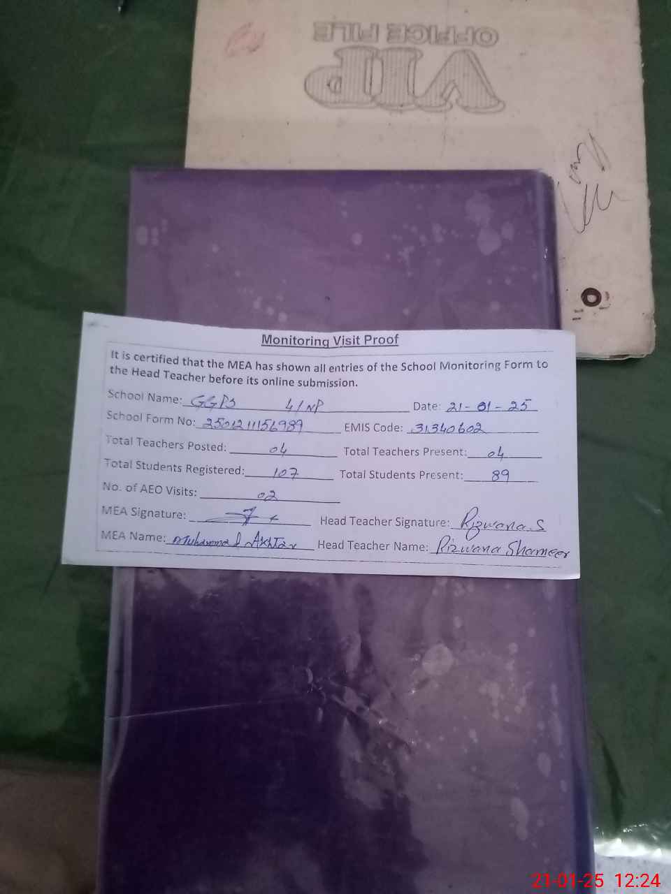 | Attendance Register | Head Teacher | MEA with School | Visit Proof |