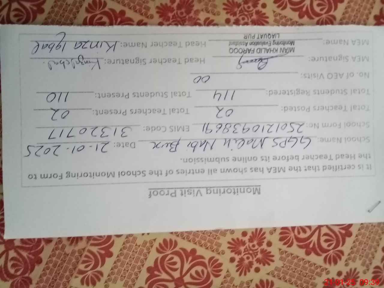 | Monitoring Date: 21-01-2025 | Start Time: 21-01-2025 09:15 AM | End Time: 21-01-2025 09:40 AM | Name of MEA: Kh**** Fa**** | |