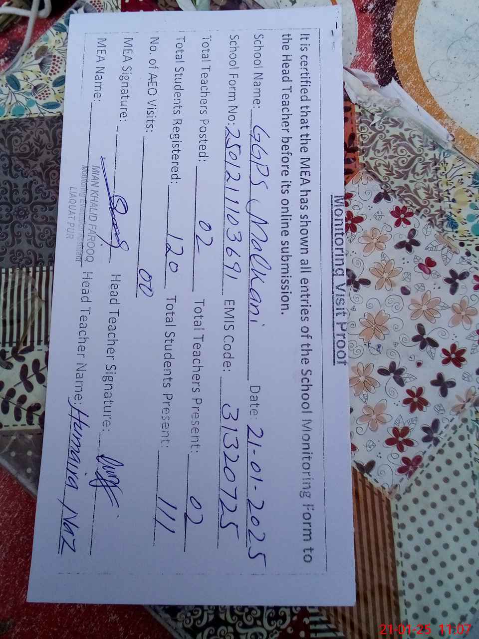| Attendance Register | Head Teacher | MEA with School | Visit Proof |
