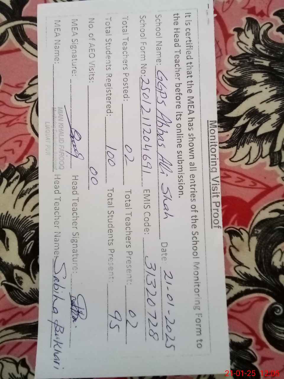 | EMIS Code: 31320728 | Name of School: GGPS ABBAS ALI SHAH | |||