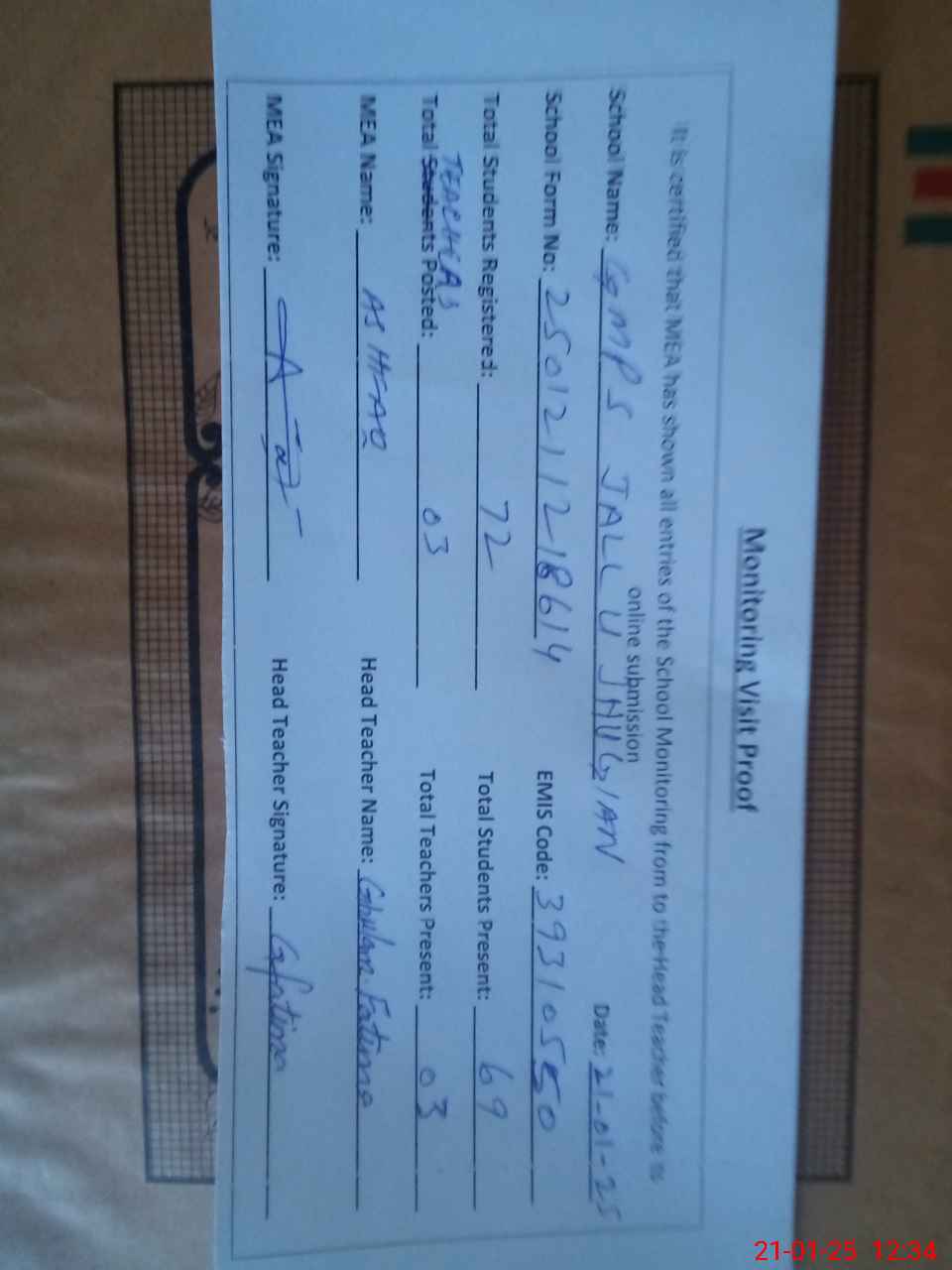 | Attendance Register | Head Teacher | MEA with School | Visit Proof |