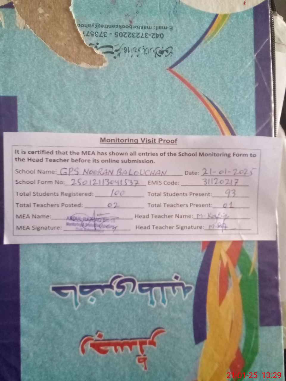 | EMIS Code: 31120217 | Name of School: GPS NOORAN BALOUCHAN | |||