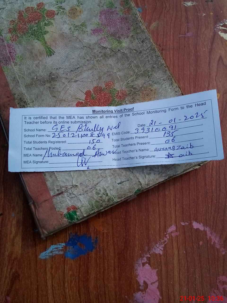 | Attendance Register | Head Teacher | MEA with School | Visit Proof |