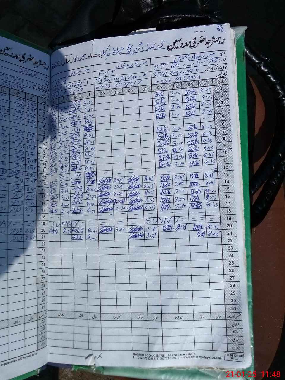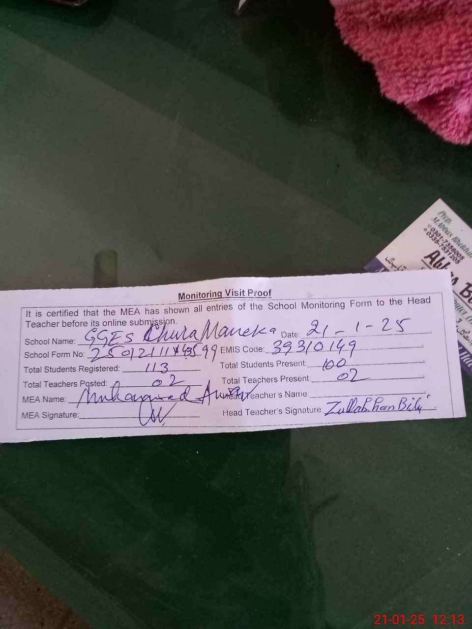 | Name: Zu**** Bi**** Designation: (School Headmaster's/Headmistress's) SST GEN Phone/Cell Number: 03**** |