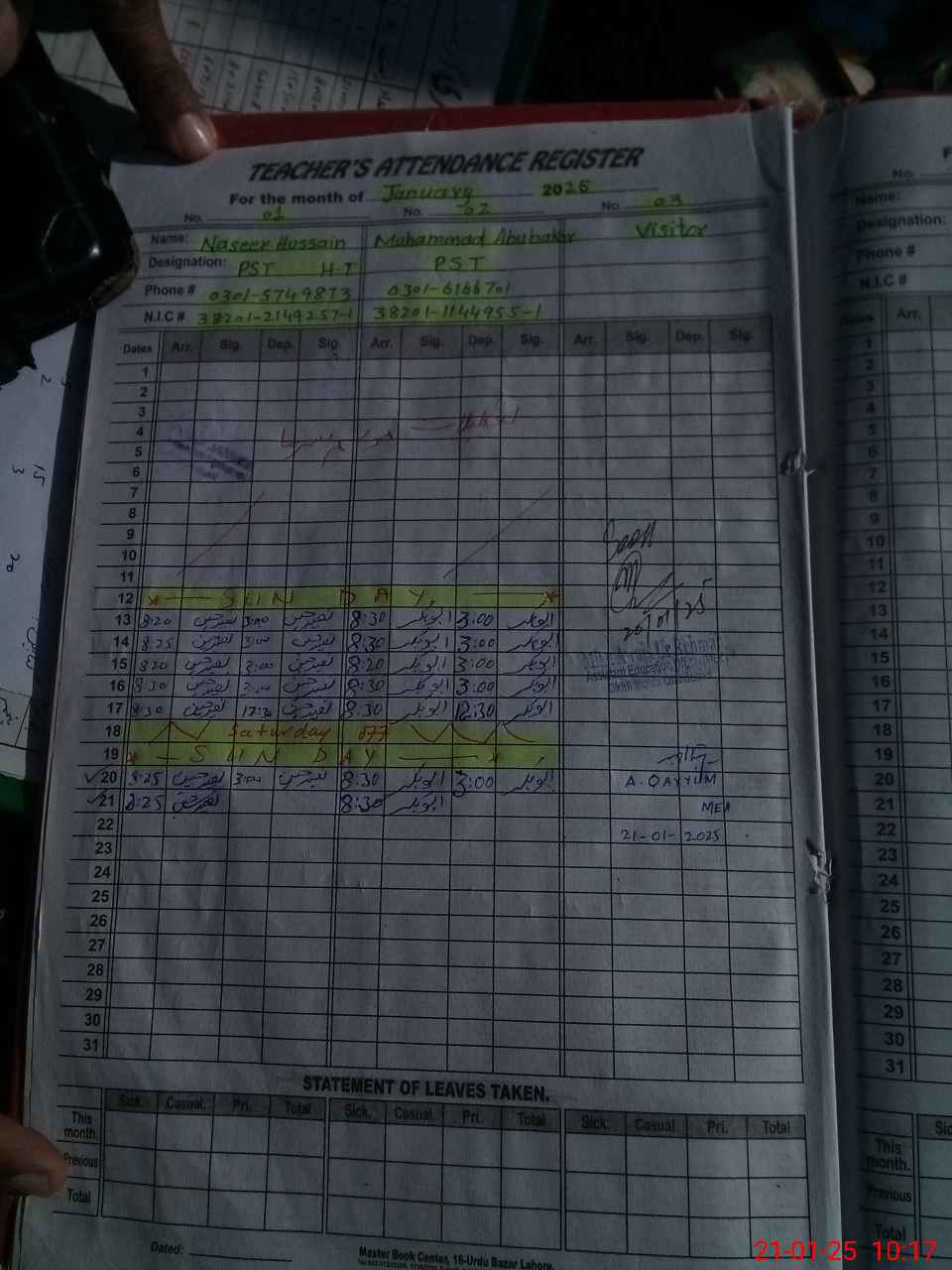 | CNIC | Full Name | Designation | R/C | Absence During Last Calender Month |