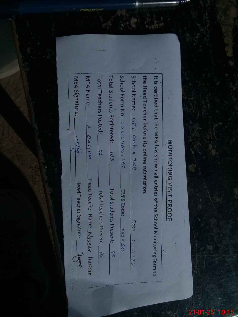 | Attendance Register | Head Teacher | MEA with School | Visit Proof |