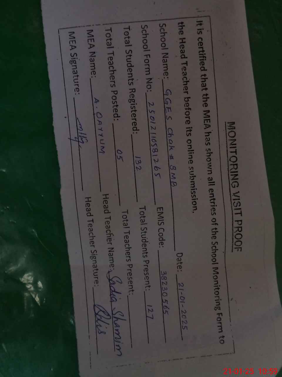 | Attendance Register | Head Teacher | MEA with School | Visit Proof |
