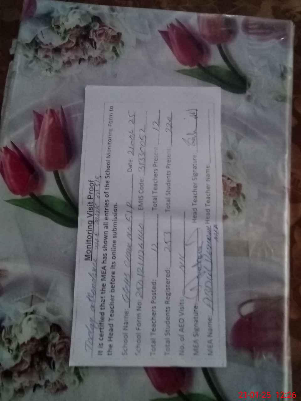 | Attendance Register | Head Teacher | MEA with School | Visit Proof |