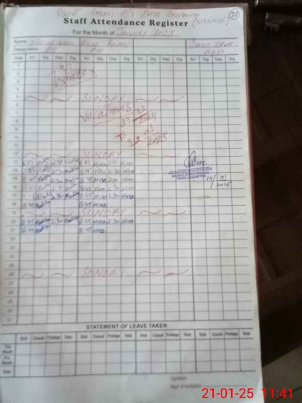 | Total no. of Classrooms: 2 No. of Classrooms Used for Teaching: 2 No. of Classrooms Storing Old Furniture, FTBs, etc: 0Comments if Any: Teachers and students presence on sis is no |