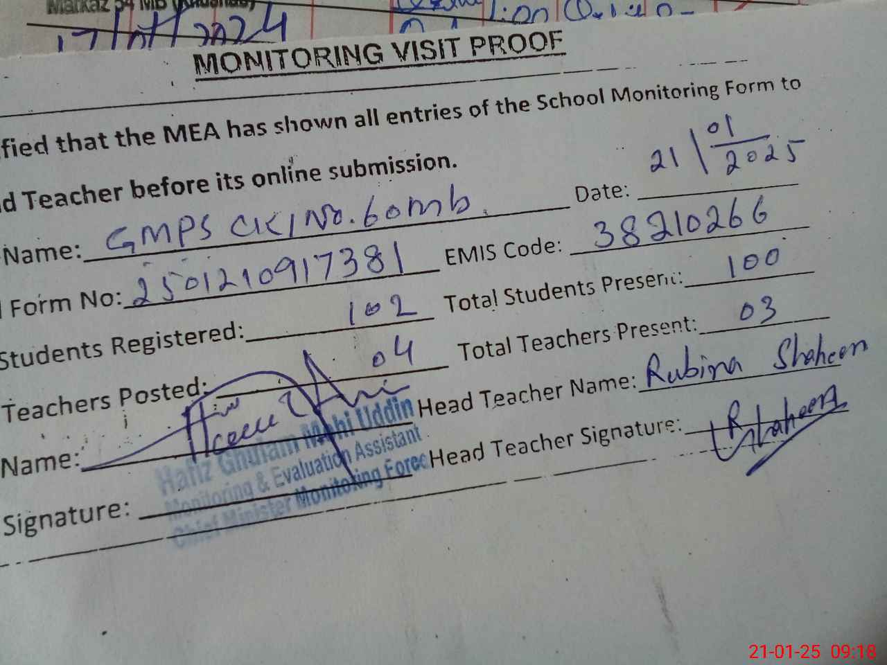 | EMIS Code: 38210266 | Name of School: GMPS CHAK NO 60 MB | |||