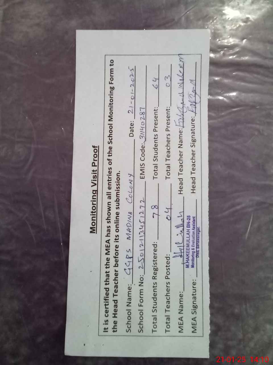 | Attendance Register | Head Teacher | MEA with School | Visit Proof |