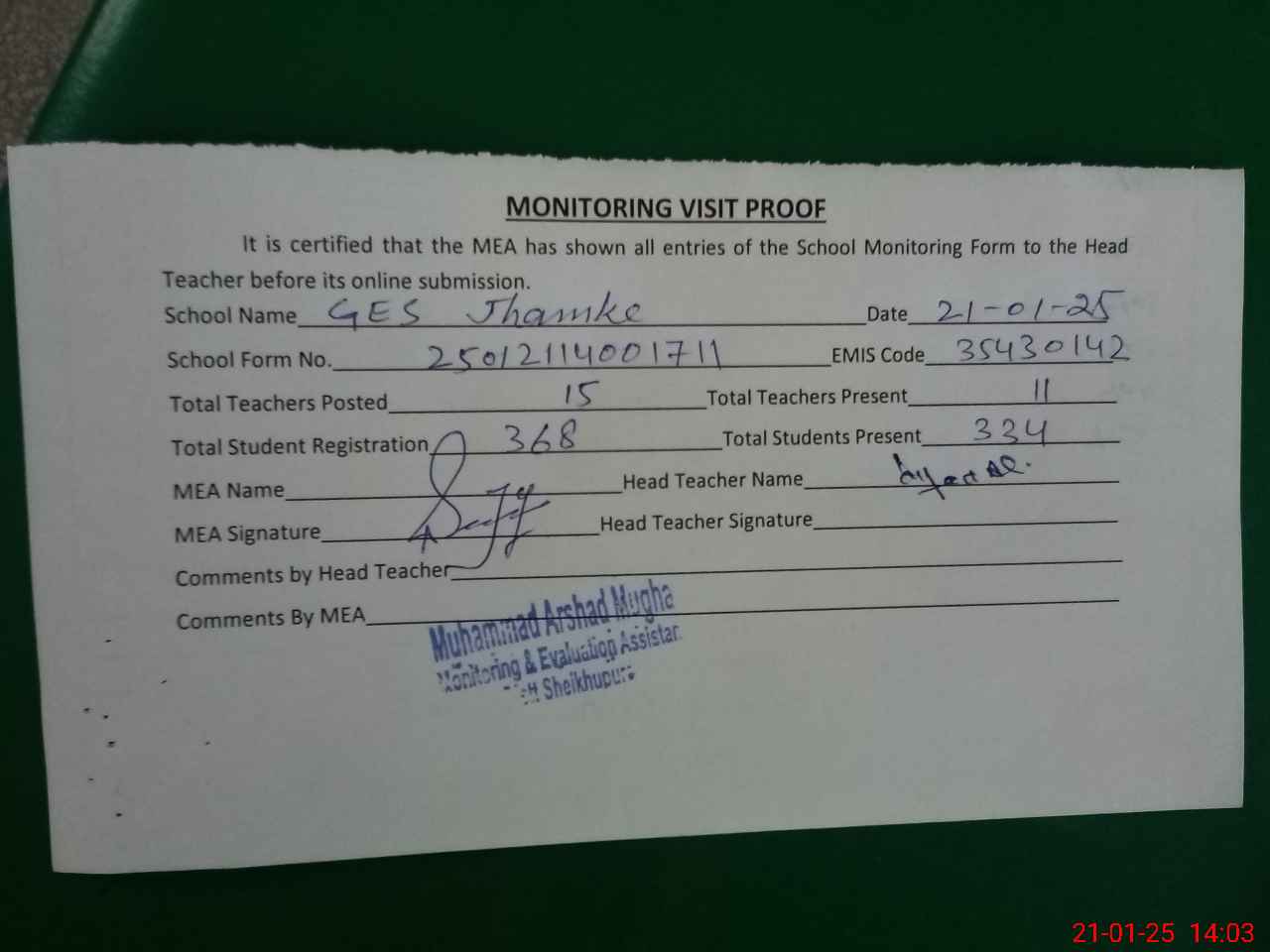 | Attendance Register | Head Teacher | MEA with School | Visit Proof |