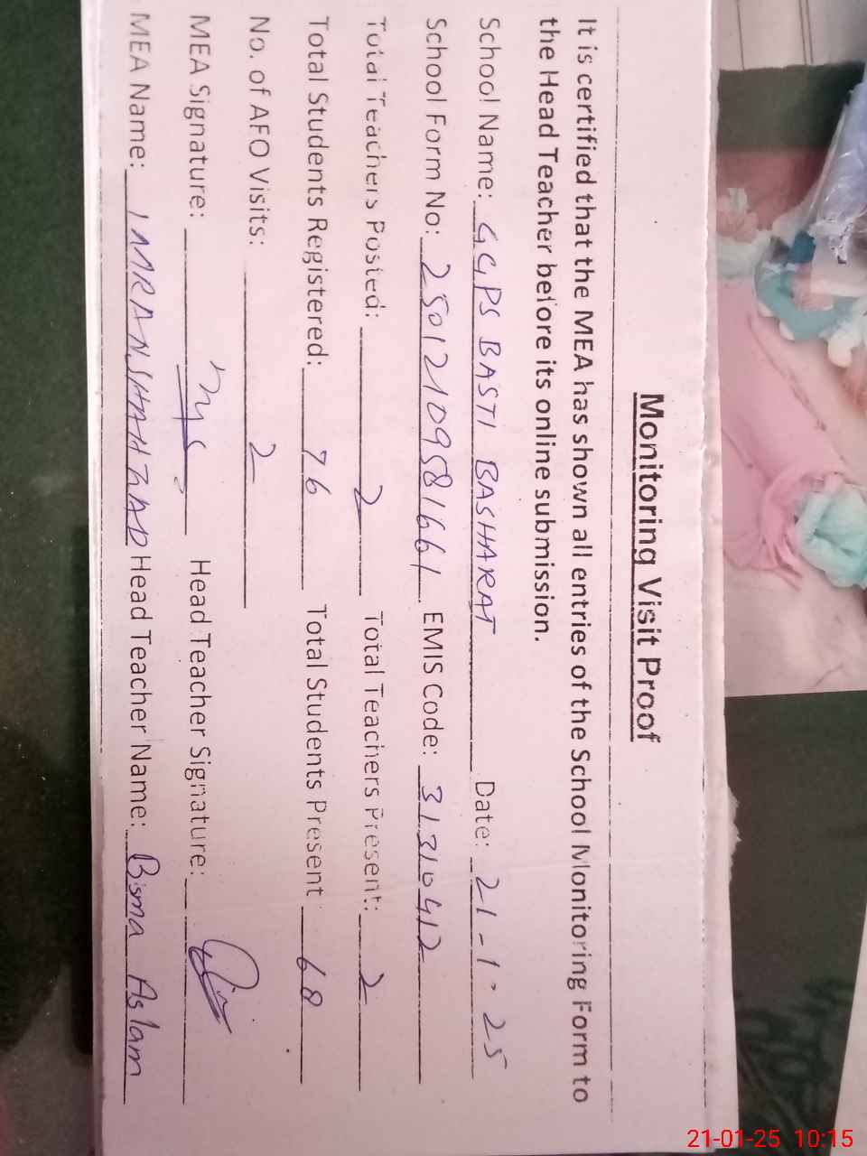 | Monitoring Date: 21-01-2025 | Start Time: 21-01-2025 09:57 AM | End Time: 21-01-2025 10:16 AM | Name of MEA: Im**** Sh**** | |