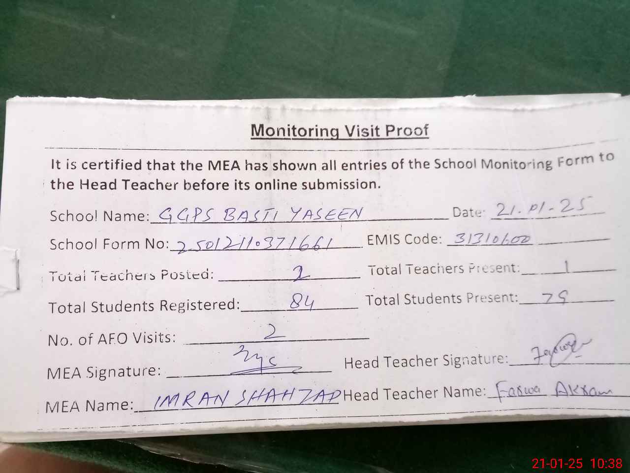 | Attendance Register | Head Teacher | MEA with School | Visit Proof |