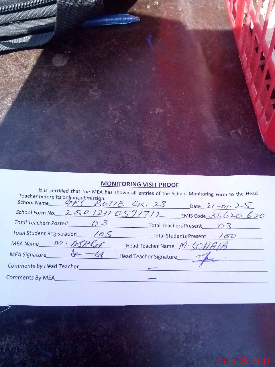 | Attendance Register | Head Teacher | MEA with School | Visit Proof |