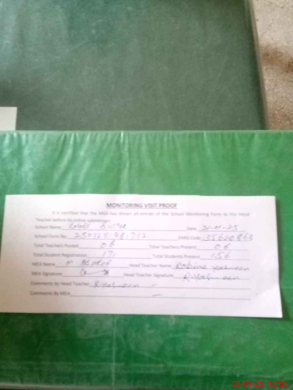| Attendance Register | Head Teacher | MEA with School | Visit Proof |