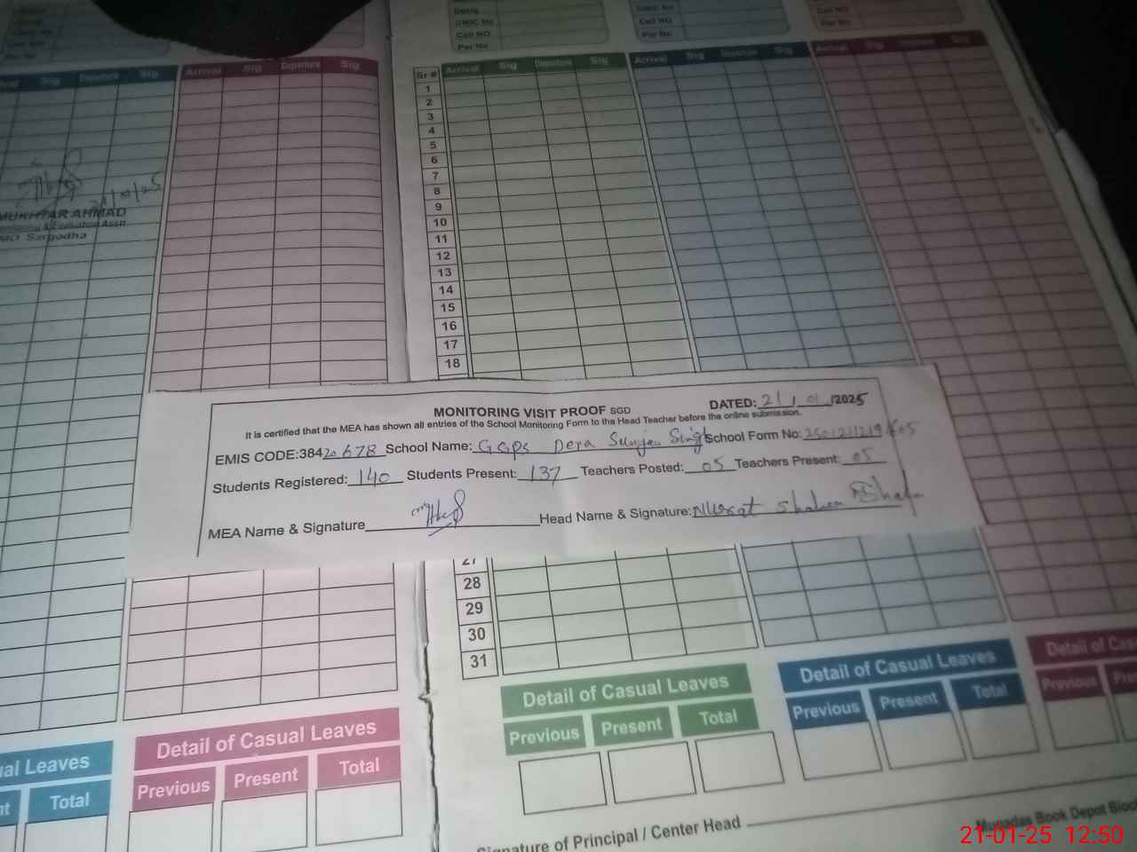 | Attendance Register | Head Teacher | MEA with School | Visit Proof |