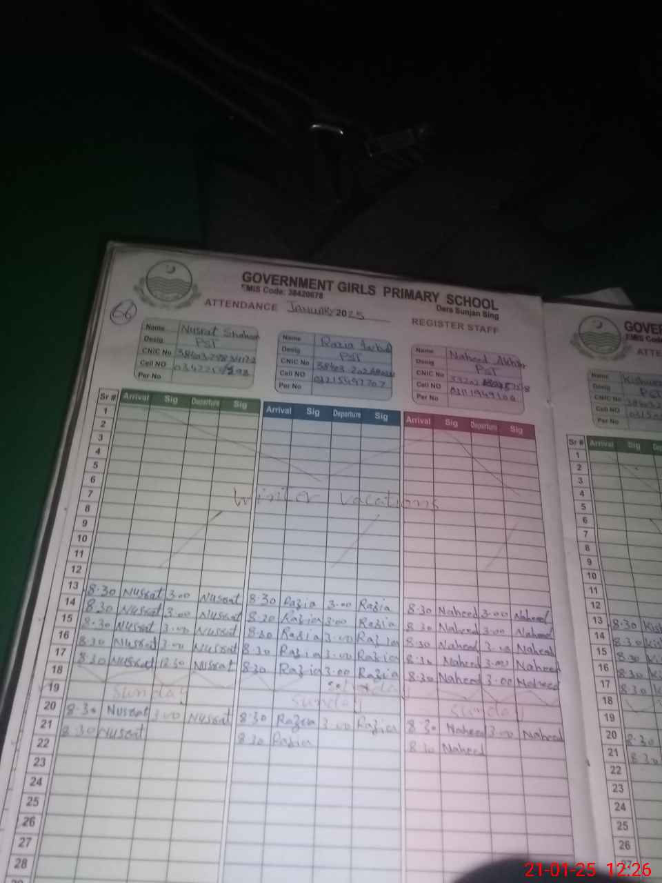 | CNIC | Full Name | Designation | R/C | Absence during last cal. month |