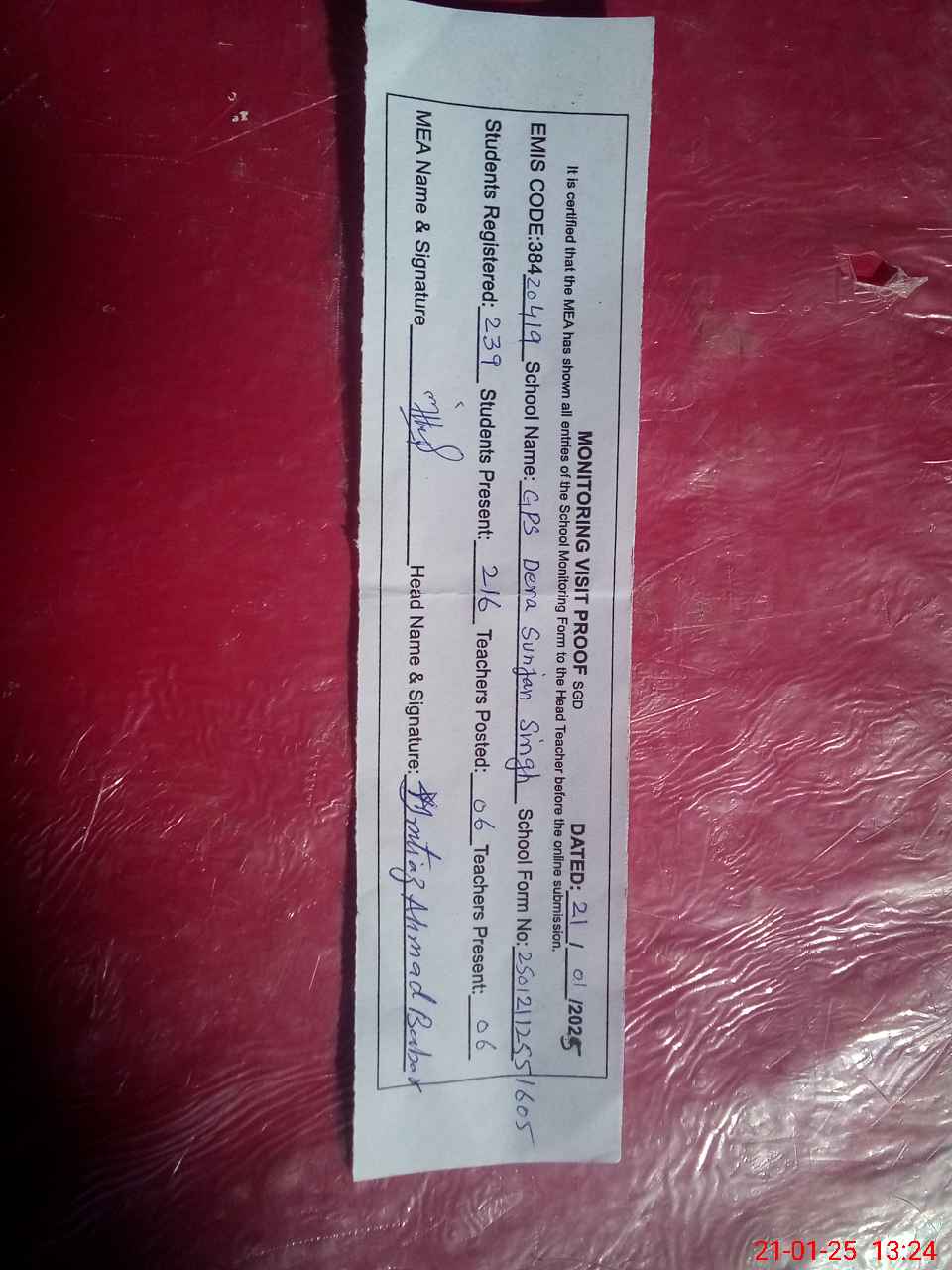 | Attendance Register | Head Teacher | MEA with School | Visit Proof |