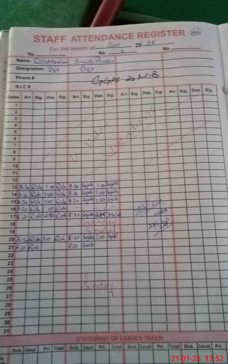 | CNIC | Full Name | Designation | R/C | Absence During Last Calender Month |