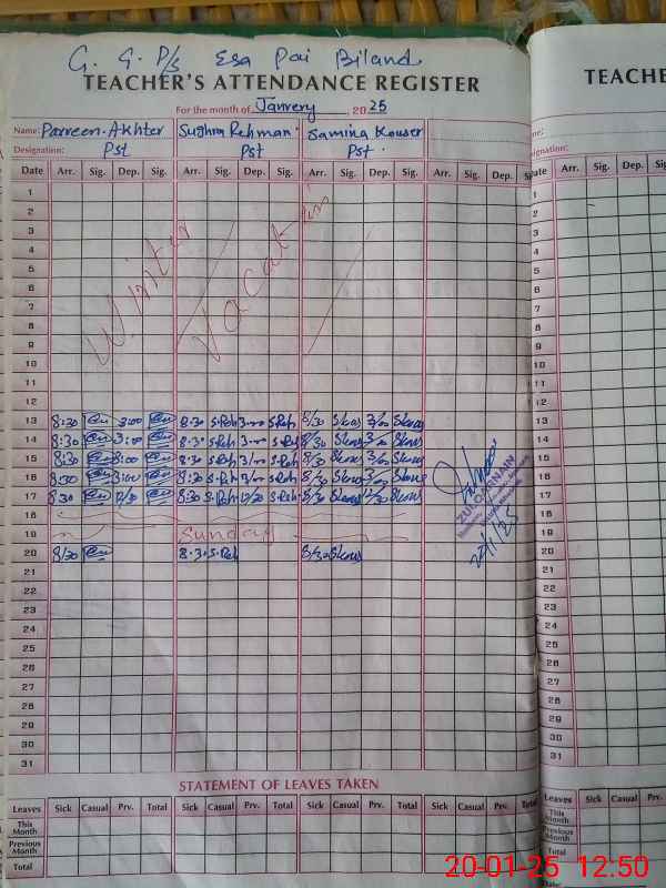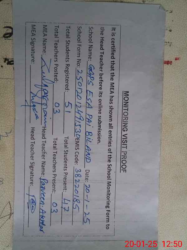 | Attendance Register | Head Teacher | MEA with School | Visit Proof |