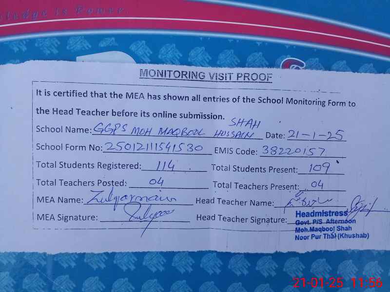 | EMIS Code: 38220157 | Name of School: GGPS MOHALLA MAQBOOL HUSSAIN SHAH | |||