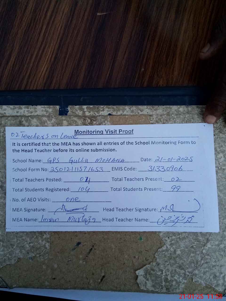| EMIS Code: 31330906 | Name of School: GPS GULLU MOHANA | |||