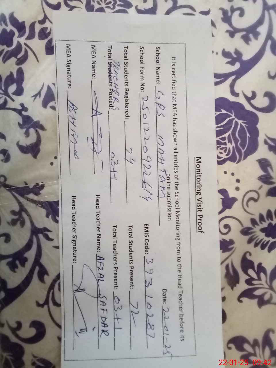 | Attendance Register | Head Teacher | MEA with School | Visit Proof |