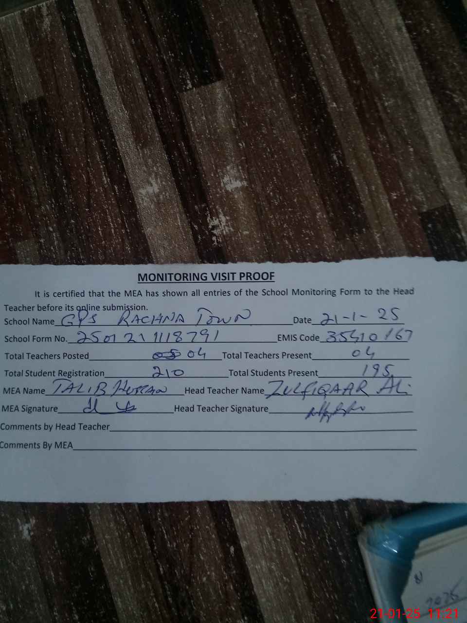 | Attendance Register | Head Teacher | MEA with School | Visit Proof |