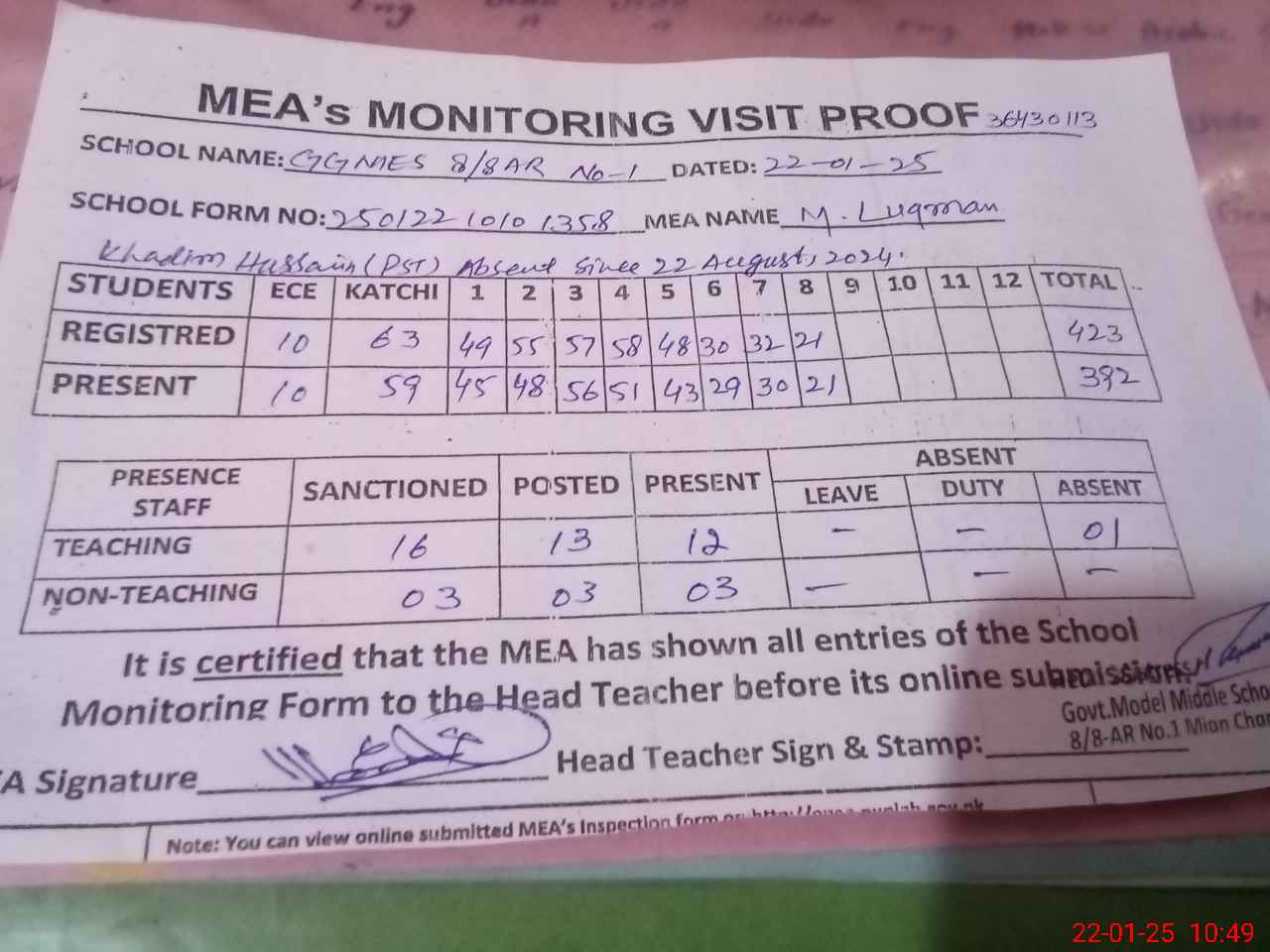 | Attendance Register | Head Teacher | MEA with School | Visit Proof |