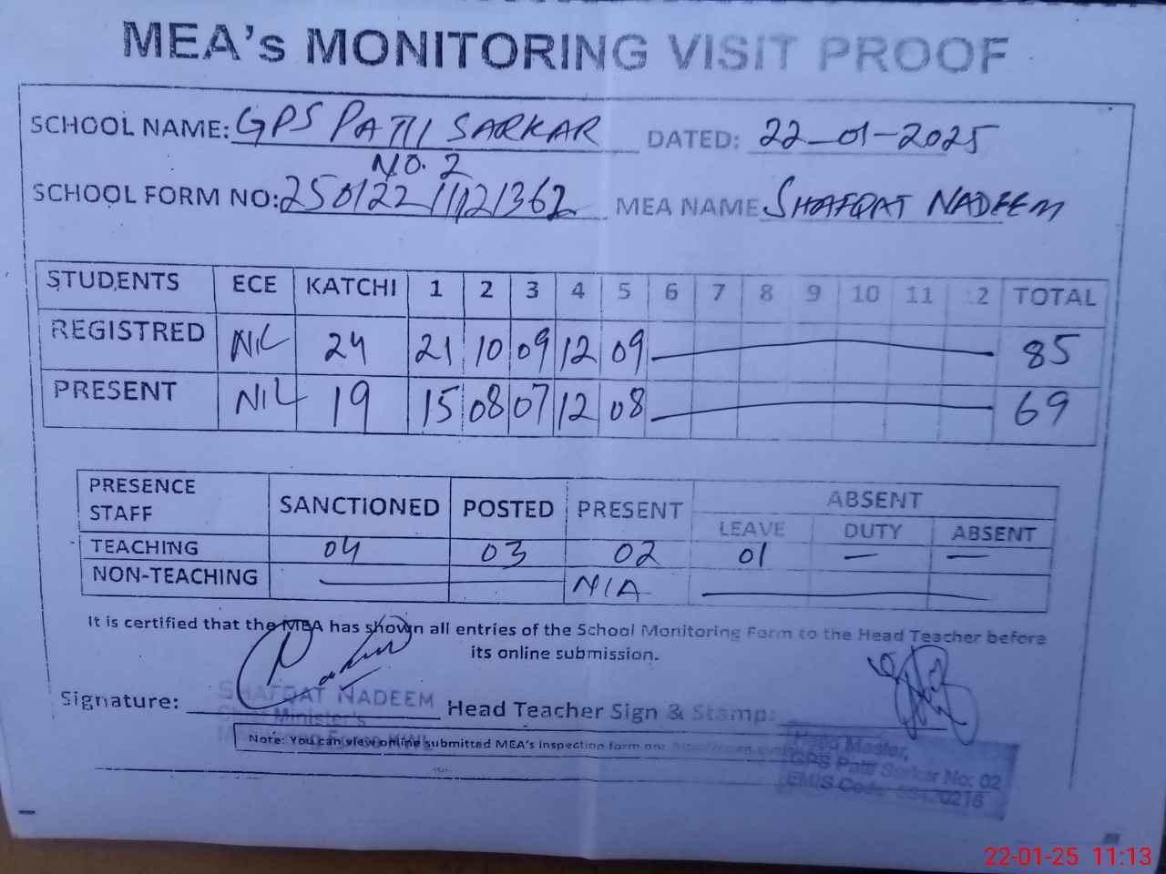 | Attendance Register | Head Teacher | MEA with School | Visit Proof |
