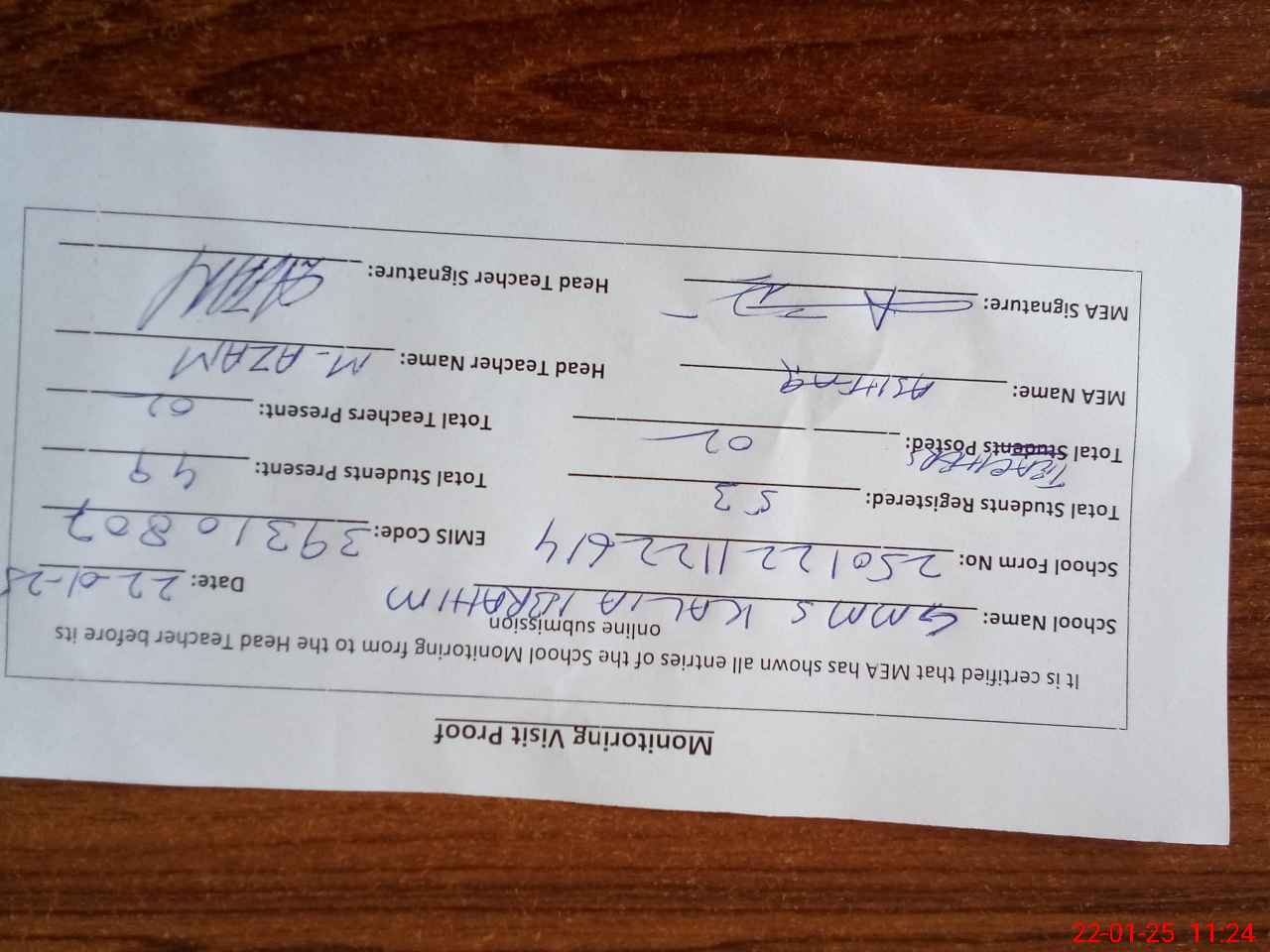 | Attendance Register | Head Teacher | MEA with School | Visit Proof |