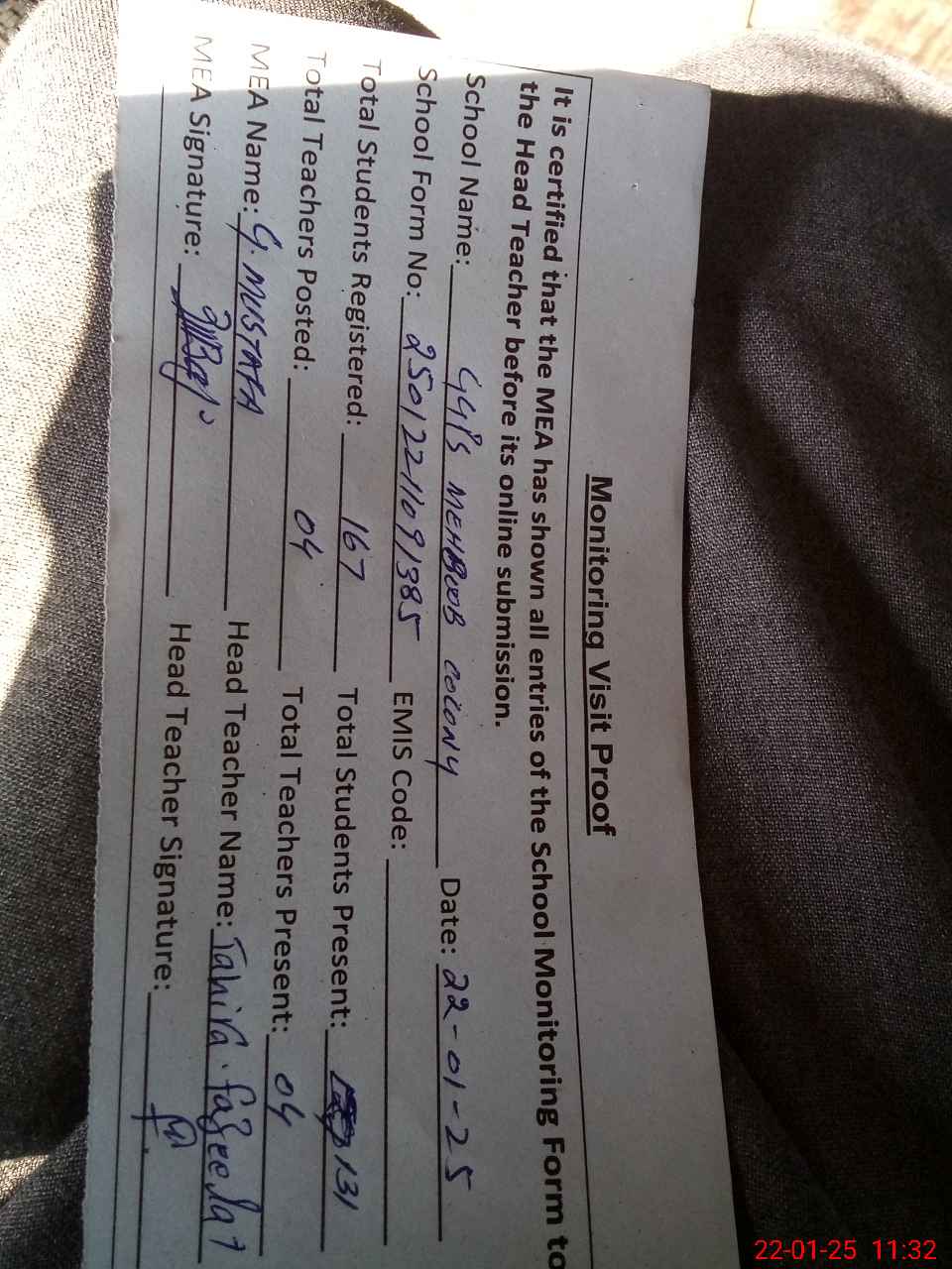 | Attendance Register | Head Teacher | MEA with School | Visit Proof |
