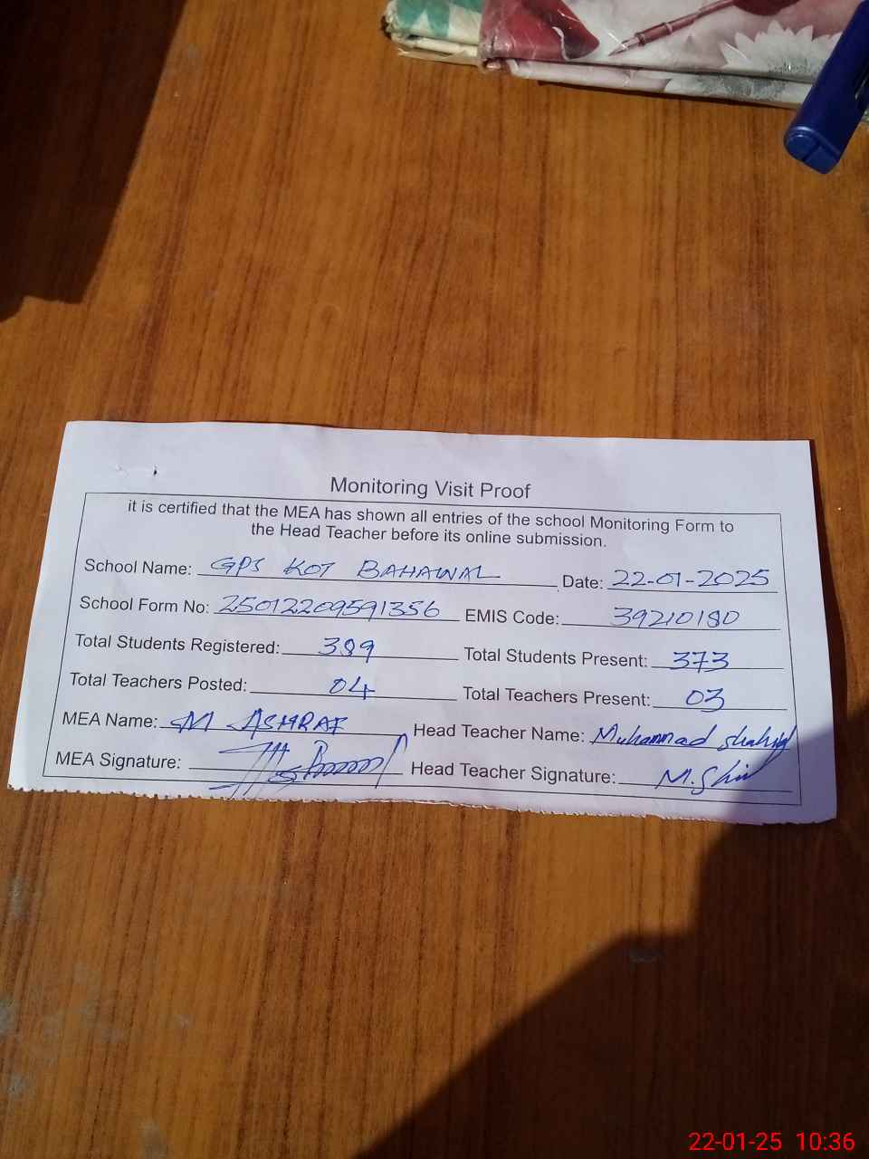| EMIS Code: 39210130 | Name of School: GPS KOT BAHAWAL | |||