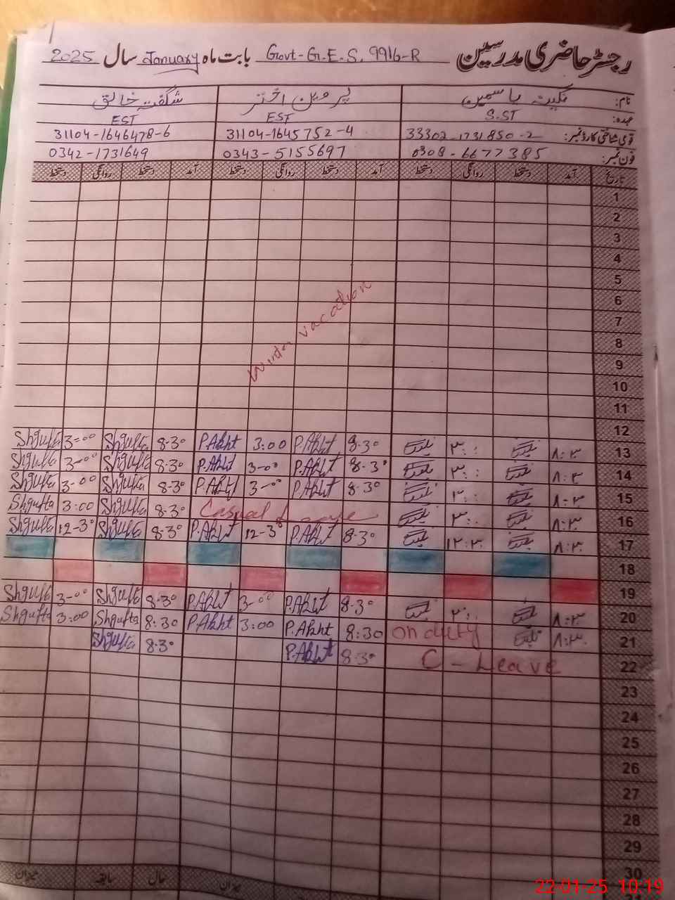 | CNIC | Full Name | Designation | R/C | Absence During Last Calender Month |