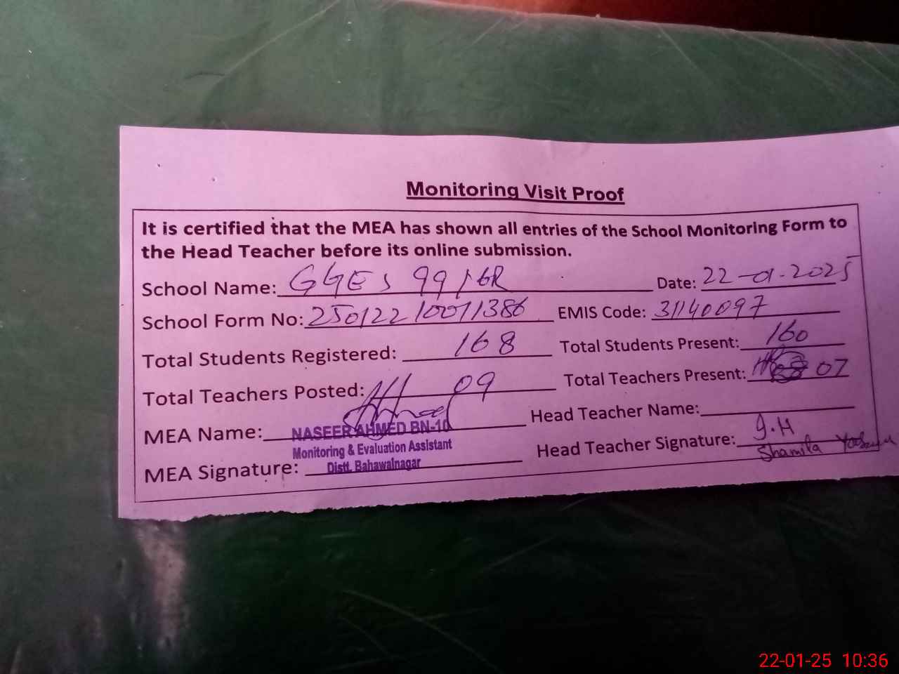 | Attendance Register | Head Teacher | MEA with School | Visit Proof |
