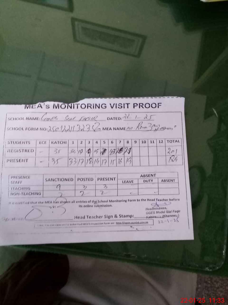 | Attendance Register | Head Teacher | MEA with School | Visit Proof |