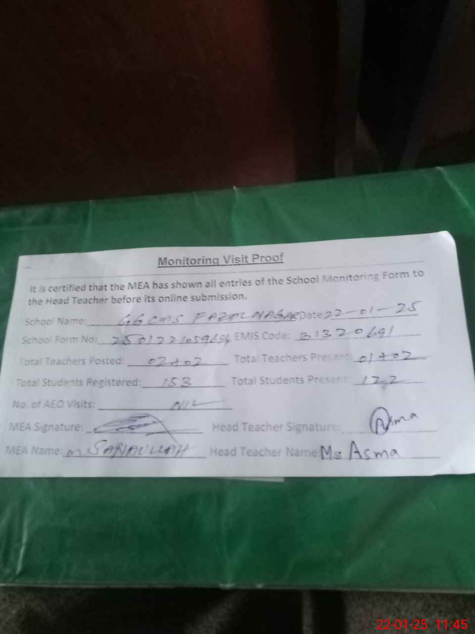 | Attendance Register | Head Teacher | MEA with School | Visit Proof |
