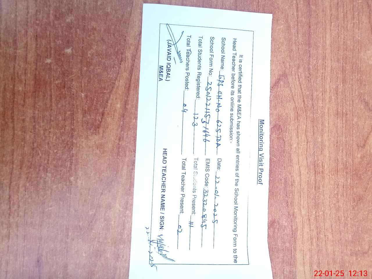 | Attendance Register | Head Teacher | MEA with School | Visit Proof |