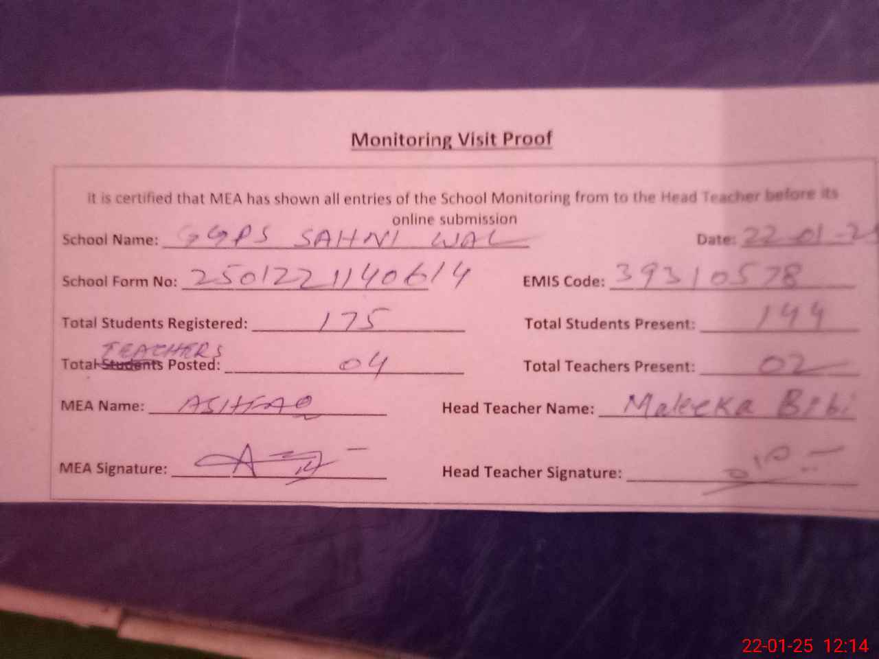 | EMIS Code: 39310578 | Name of School: GGPS SAHNI WAL | |||