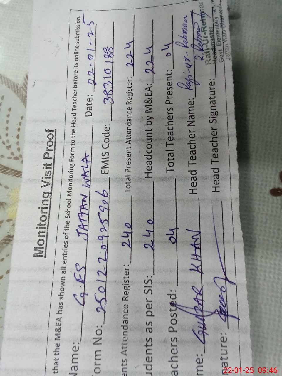 | Name: RA**** URRE**** Designation: (School Headmaster's/Headmistress's) SST G Phone/Cell Number: 03**** |