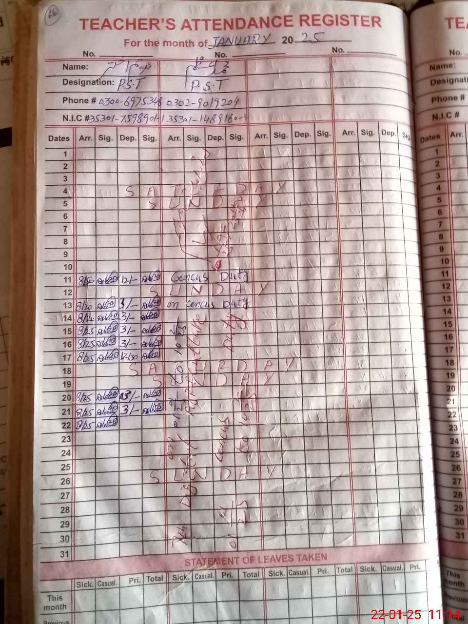 | Name: NA**** AK**** Designation: (School Headmaster's/Headmistress's) PST Phone/Cell Number: 03**** |