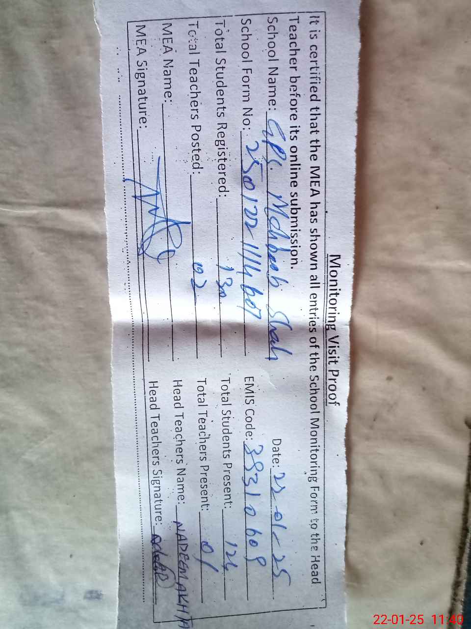 | Attendance Register | Head Teacher | MEA with School | Visit Proof |